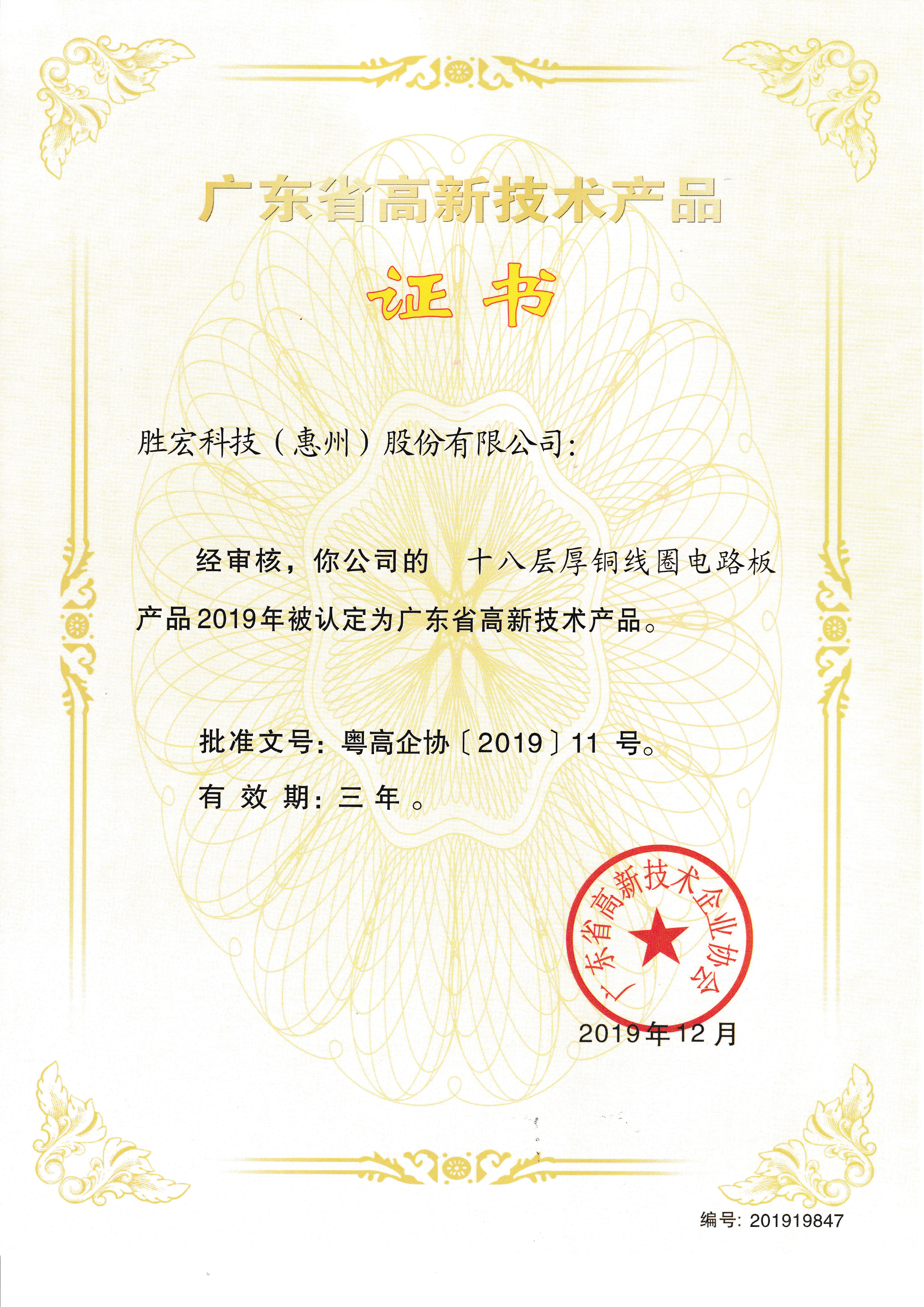 “十八层厚铜线圈电路板”高新手艺产品证书