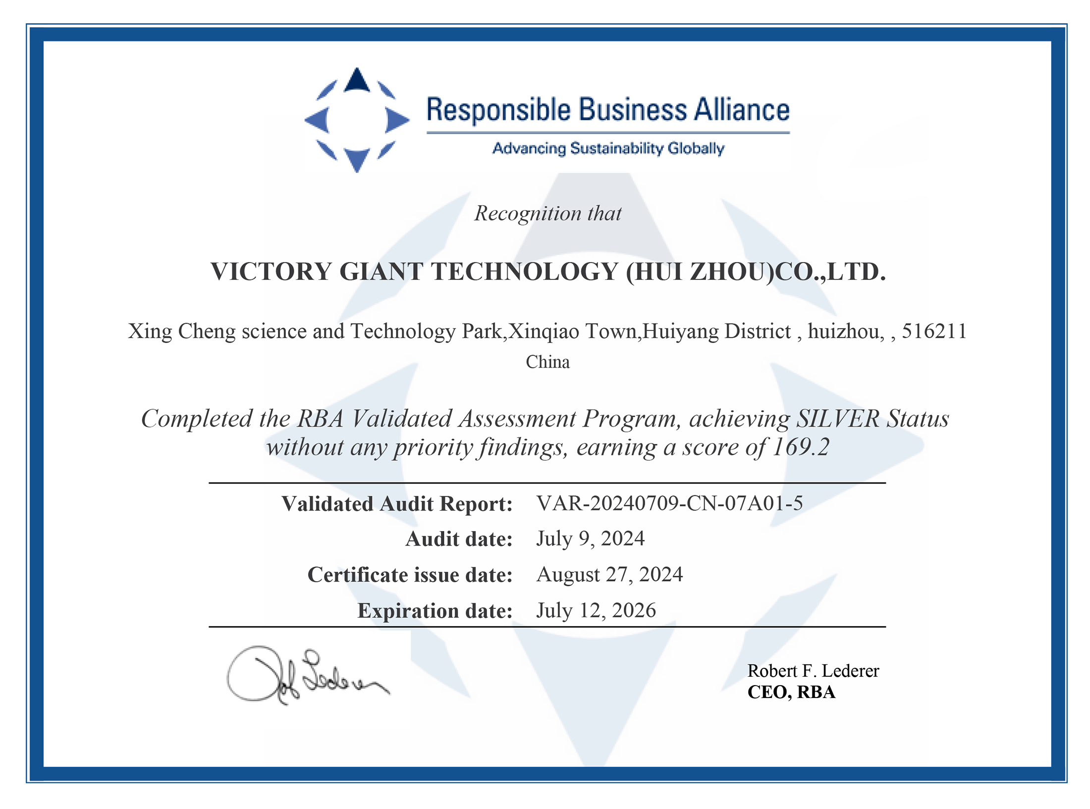 RBA VAP 社会责任审核证书